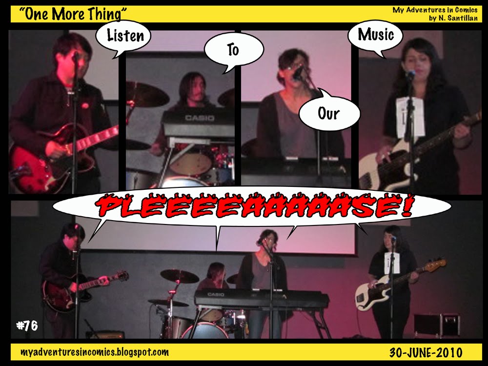 Basically this comic and the last two ones are set in the same venue. Our band BOX OF BIRDS played at this new(ish) venue called The Strange near LACC. It’s pretty spacious with a good sound system. However, it is implied in this comic that there is no audience. That’s not completely true. There were 3 people in the audience: the sound guy, the door lady and the girlfriend.