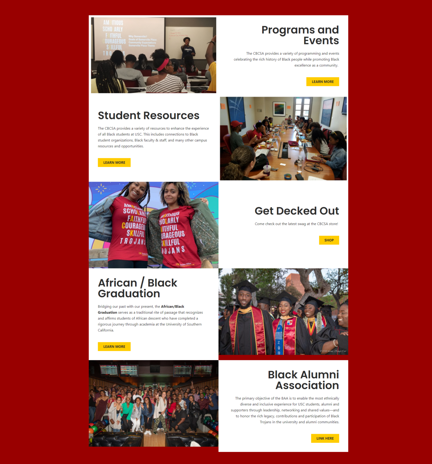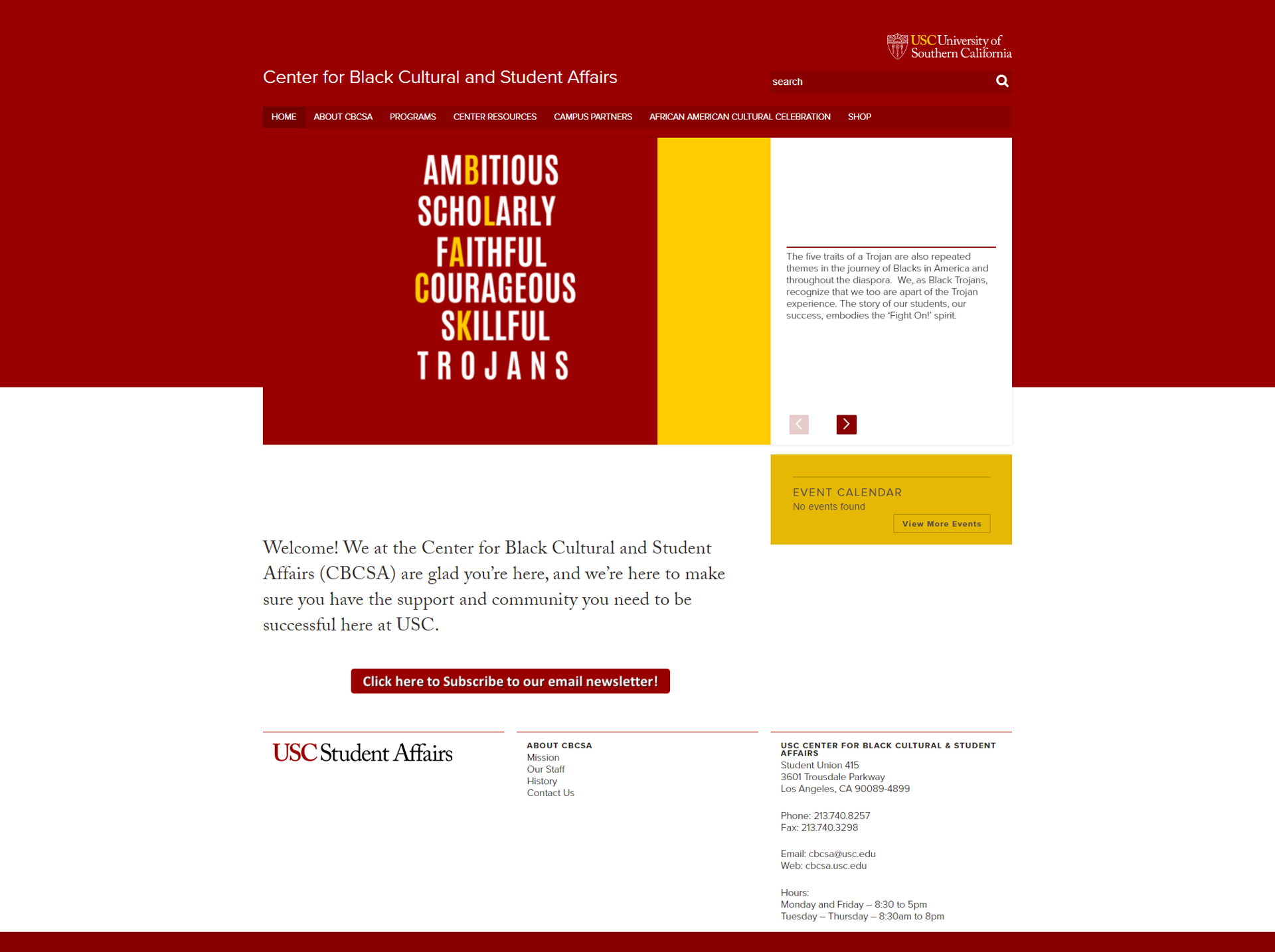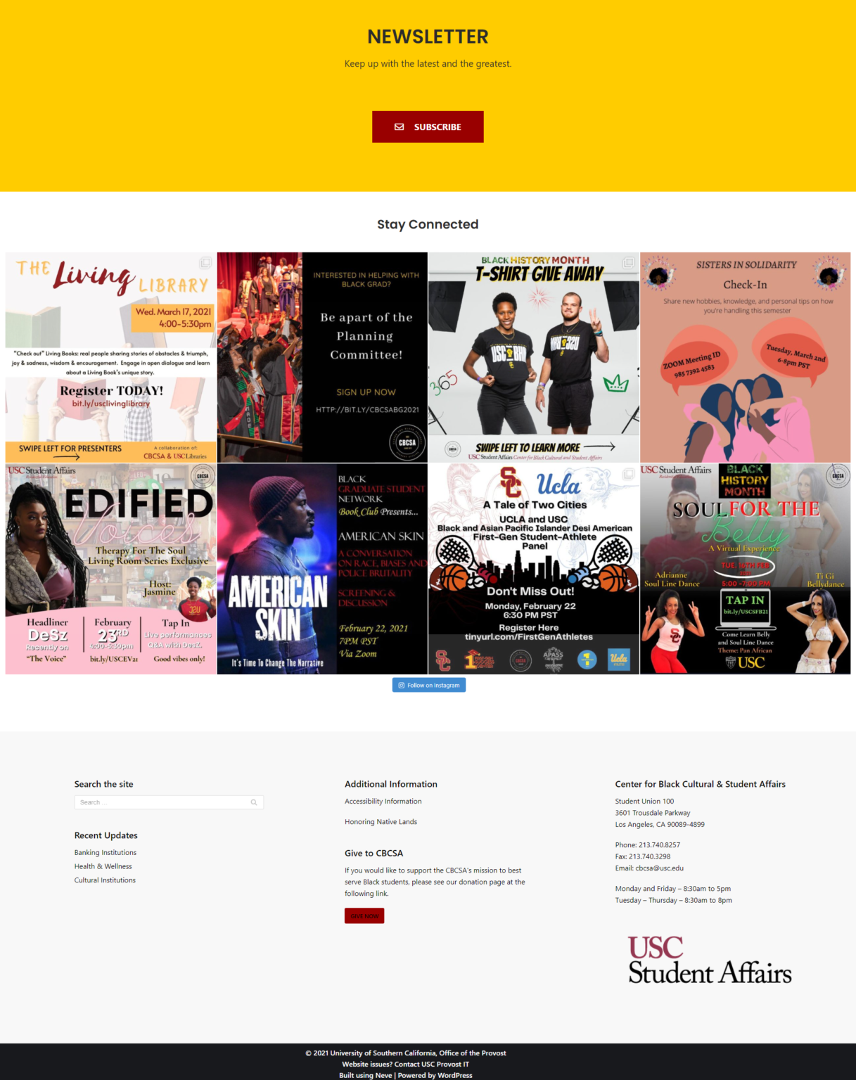 One challenge posed by the project was the concept of Black Community Calendar. Many other websites and units have requested calendars in the past and it was easy to either implement The Events Calendar, direct users to the USC Events Calendar, or a combination of both. Additionally, Student Affairs had just started using the Engage Calendar from Campus Labs. So, special thought and care had to be put into the reasoning behind setting up a calendar and processes behind adding and maintaining events had to be created.